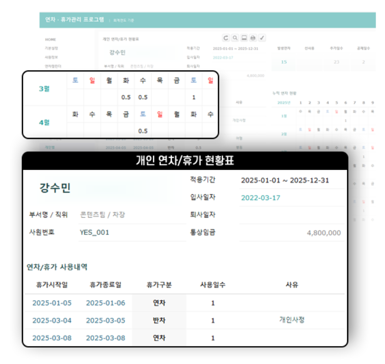 사원별 월간현황 | 연도별 월별 연차현황 |