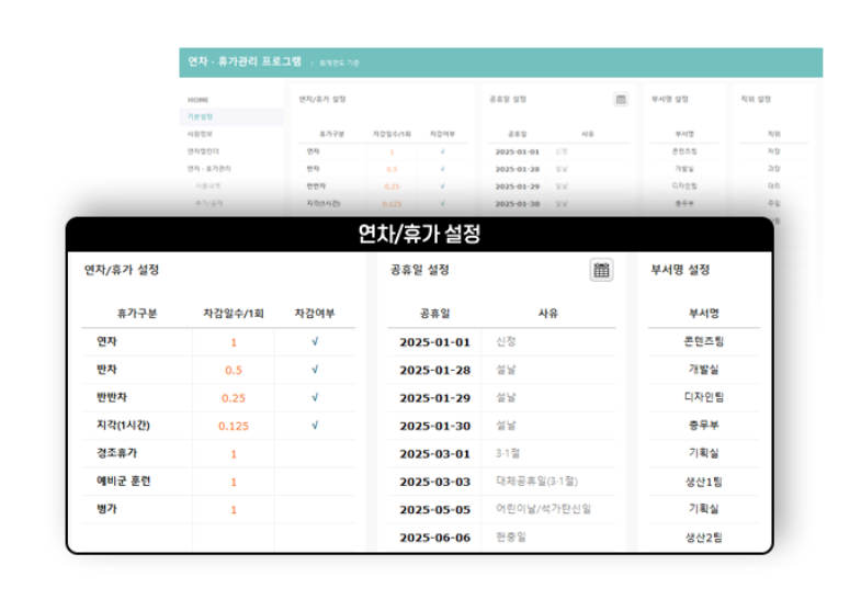 | 기본설정 | 연차설정 및 공휴일 자동 업데이트 | |