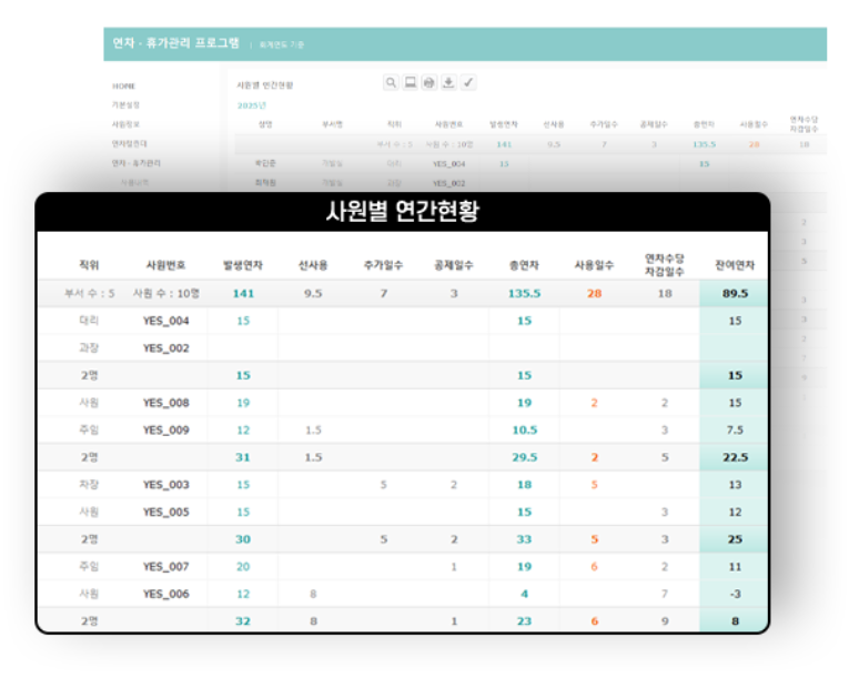 | 사원별 연간현황 | 연간 사원별 연차현황 | |