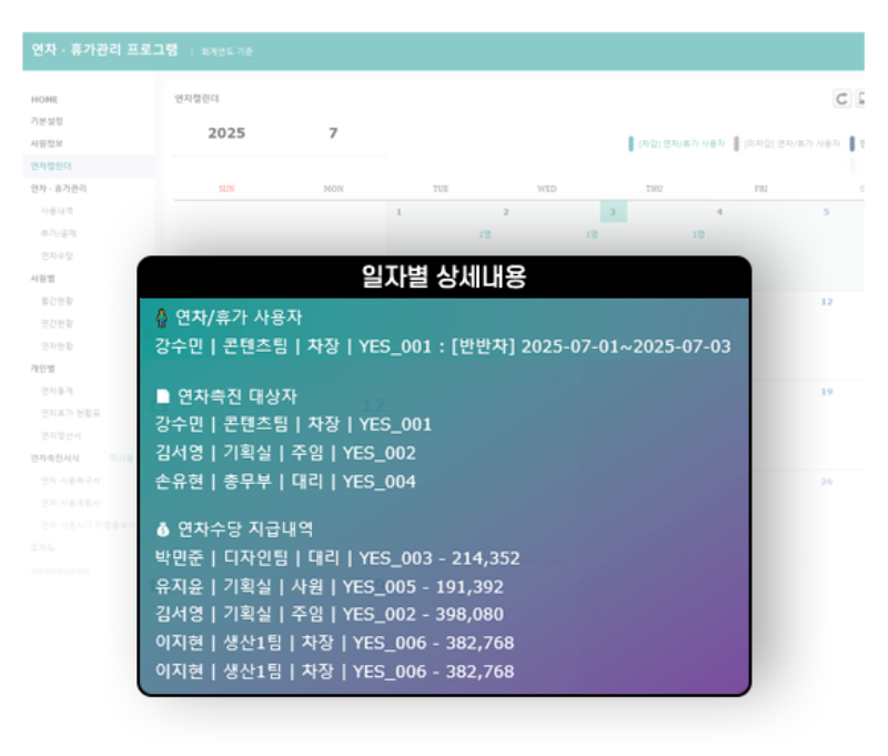 연차 휴가 사용자, 연차수당 지급액 현황이 캘린더로 표시됩니다.