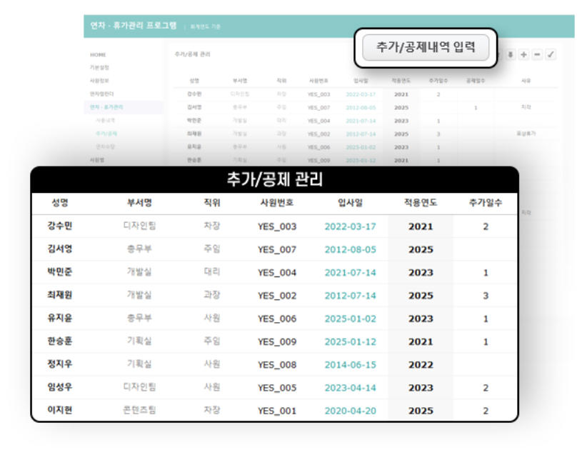 | 연차휴가 추가공제 관리 | 연차 추가 공제내역 입력 | |