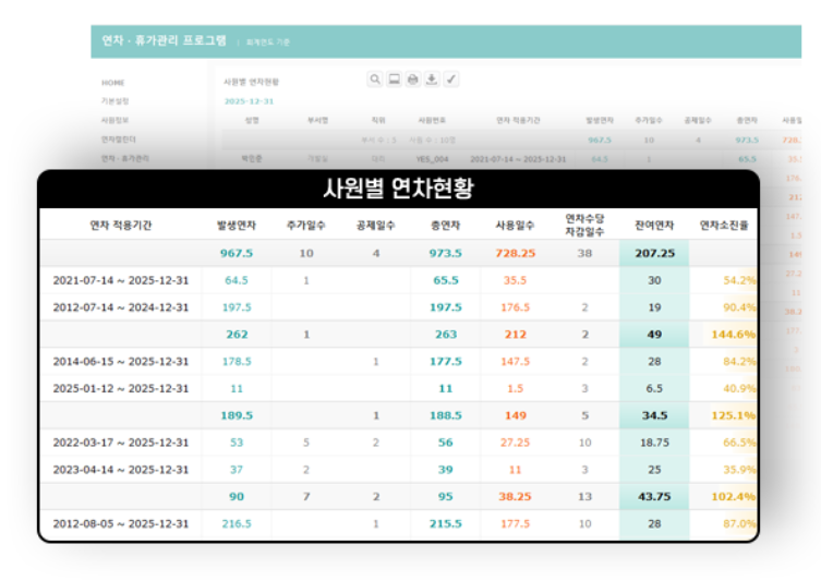전체 사원의 연간 연차현황을 한눈에 확인할 수 있습니다.