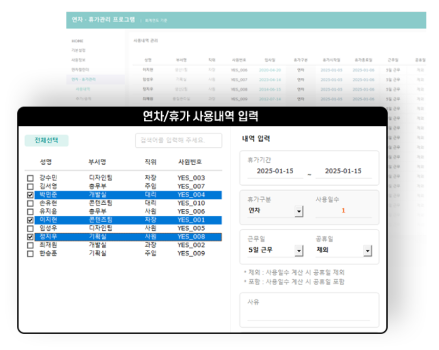 사용내역 입력 및 잔여연차를 일괄 소진 이월할 수 있습니다.