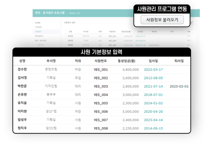 입사일 기준 연차 발생연차가 함께 표시되어 연차정산 시 참고할 수 있습니다.