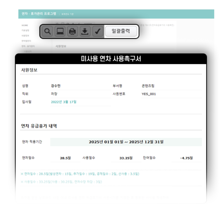미사용 연차서식 인쇄, 내보내기 기능을 제공합니다.