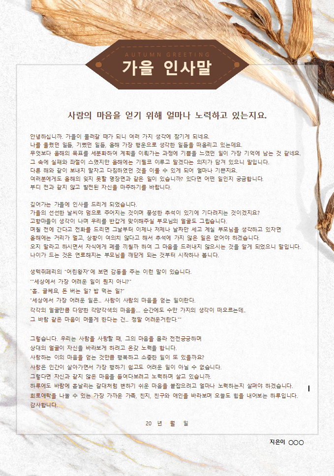 사람의 마음을 얻기 위해 어린왕자의 예를들며 노력해야 한다는 내용의 가을인사말 양식입니다. 제목과 부제목 및 인사말내용을 기재하는 가을인사말 양식입니다.