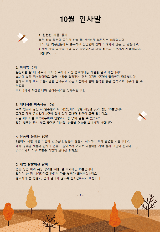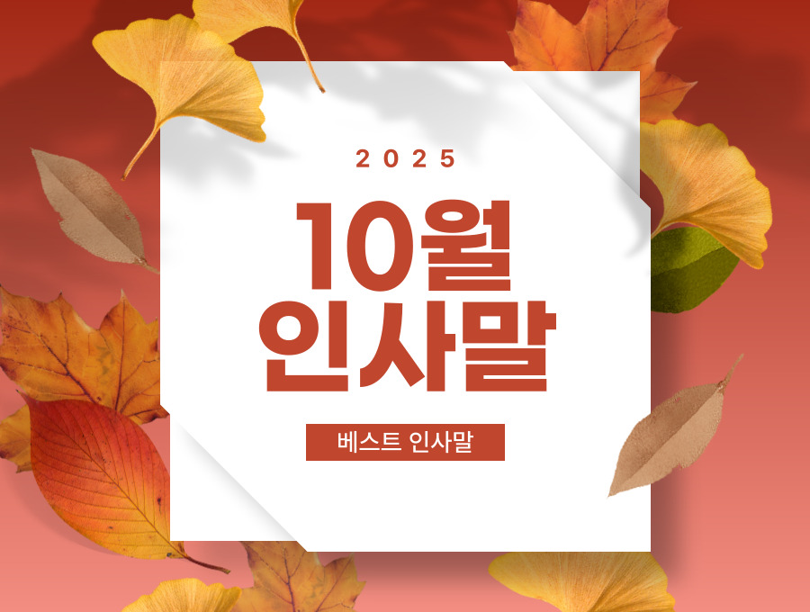 "단풍이 아름답게 물들어가는 10월을 맞아 인사드립니다. 올해 마지막 분기, 함께 협력하여 더욱 의미 있는 성과를 만들어가길 바라며, 건강하고 활기찬 가을 보내시길 기원합니다."