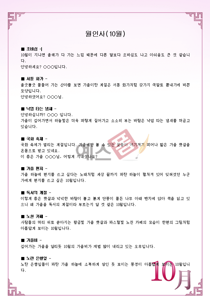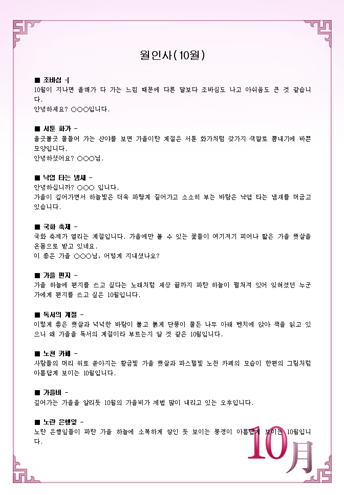 10월 인사말 양식 서식.샘플 문서자료