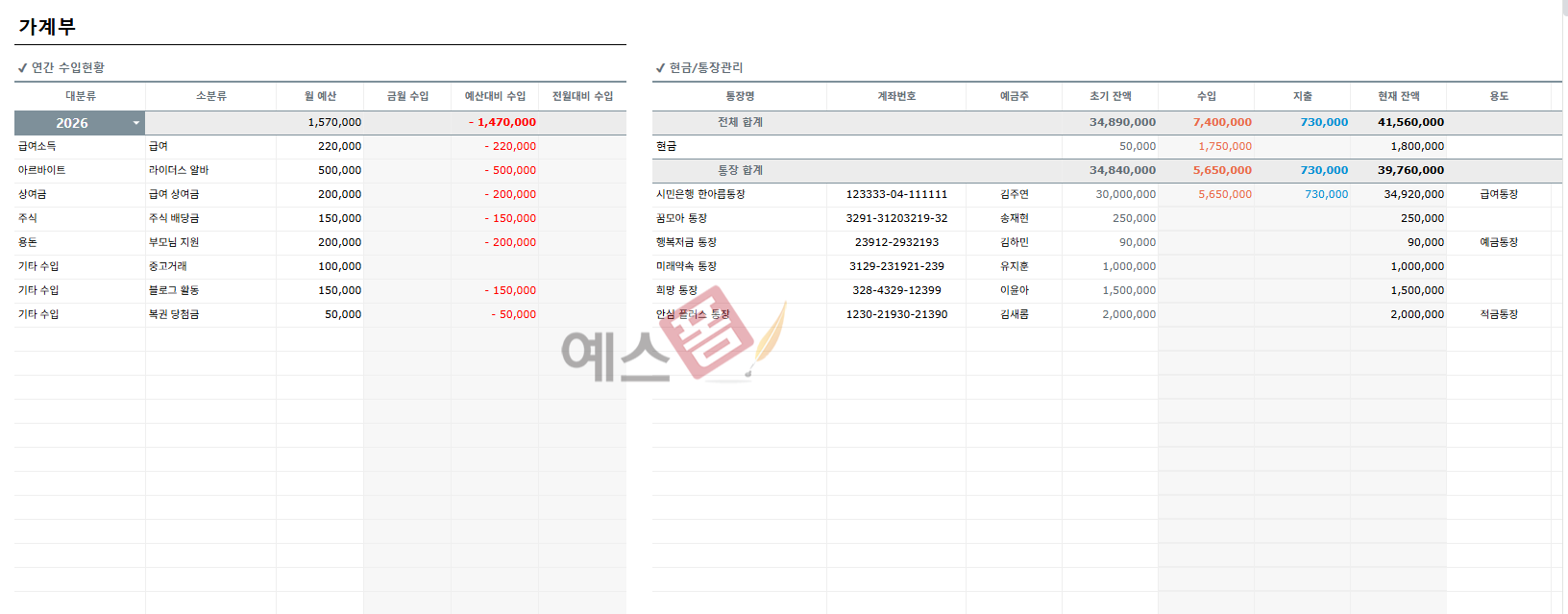 가계부 관리대장 구글 스프레드시트 - 예스폼 엑셀서식
