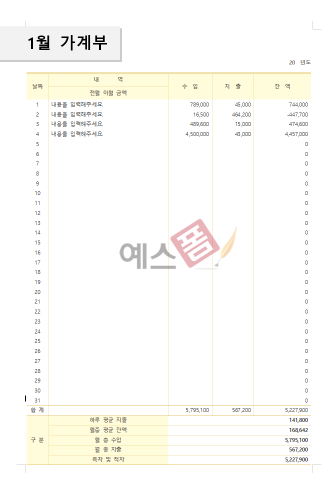 다양한 문서서식을 한 눈에!! '월간 가계부' 국내 1위 문서서식 플랫폼 예스폼 통합검색의 결과 입니다. 계약서, PPT, 사업계획서, 회사문서, 엑셀 프로그램등 다양한 문서서식을 경험해 보세요.