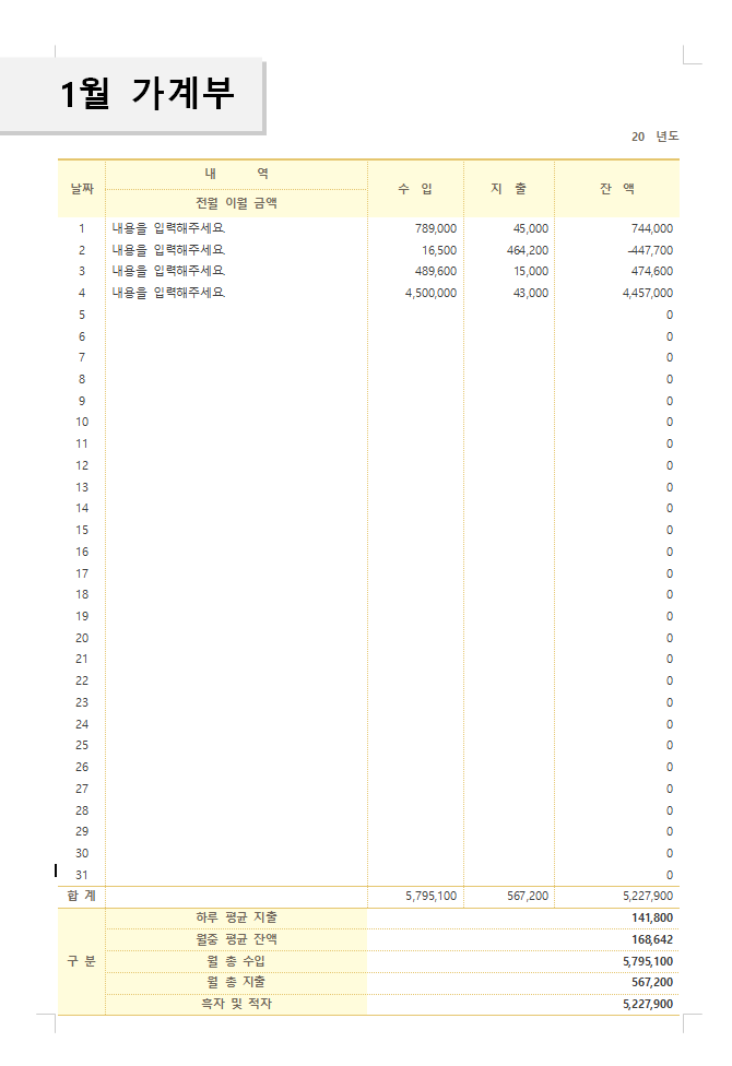 1년치의 가계 수입/지출 내역을 간편하게 관리할 수 있는 간편형 가계부입니다. 수입/지출 항목을 분류별 최대 6개까지 입력/편집할 수 있으며, 각 항목별 연간 예산을 설정할 수 있습니다. 예산