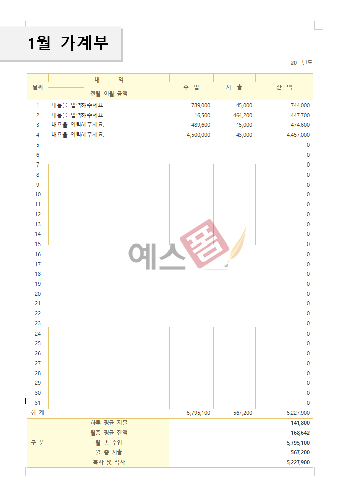 월간 가계부 양식 서식.샘플 문서자료
