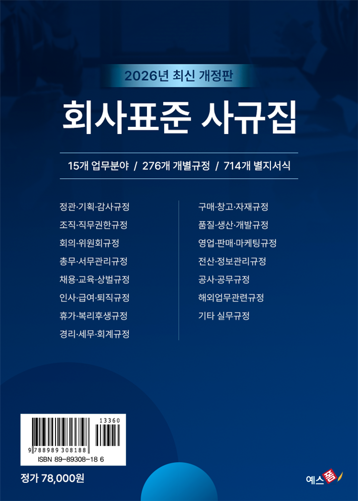예스폼에서는 273개 규정, 704개 별지서식을 포함한 2026년 회사표준사규집을 제공하고 있으며, 법무 검토를 거친 신뢰도 높은 문서를 통해 누구나 쉽게 사규집을 작성하실 수 있습니다. 지금 바로 예스폼에 방문하셔서 2026년 회사표준사규집을 다운로드하고, 안정적이고 체계적인 기업 운영을 시작해보시길 바랍니다! 💼