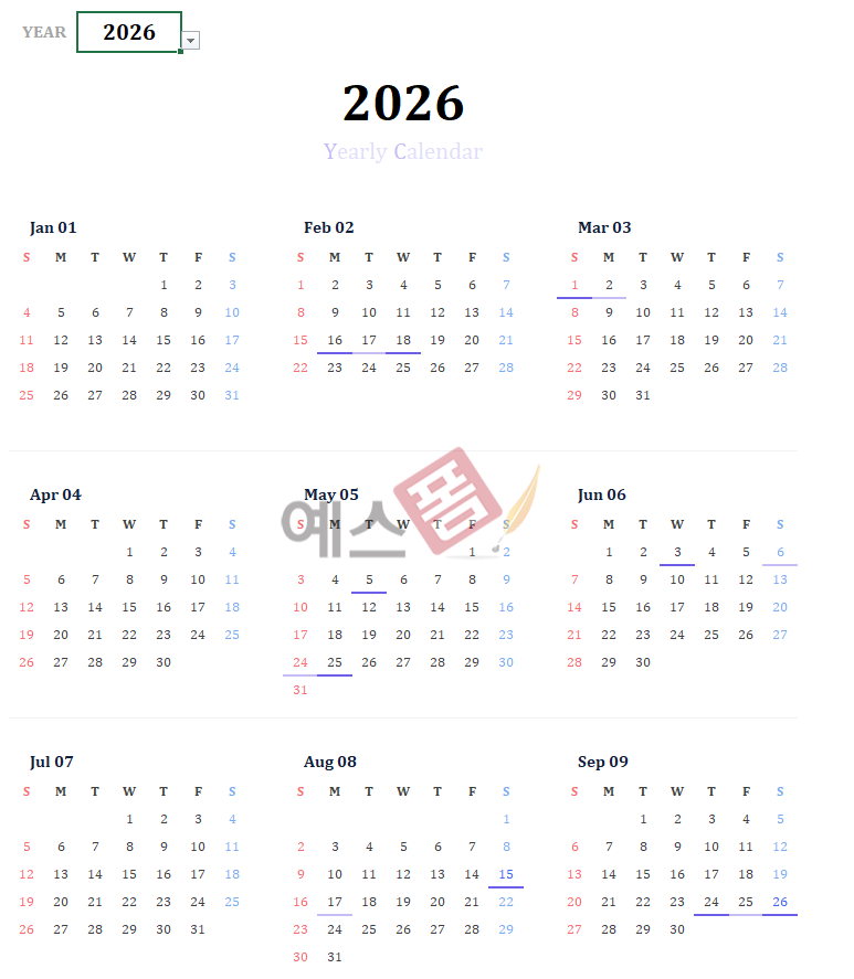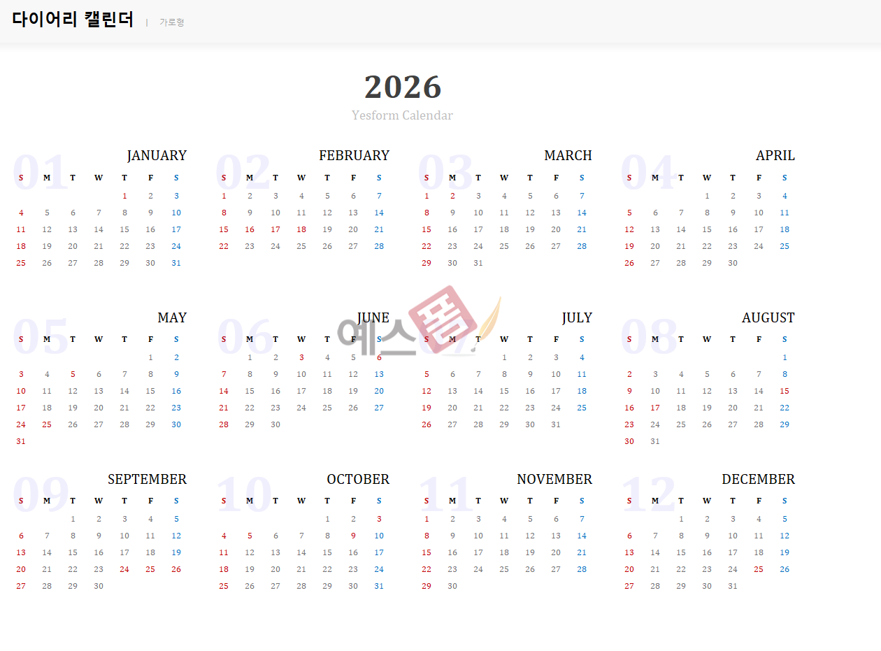 [2026년] 달력_Yearly Calendar - 예스폼 엑셀서식