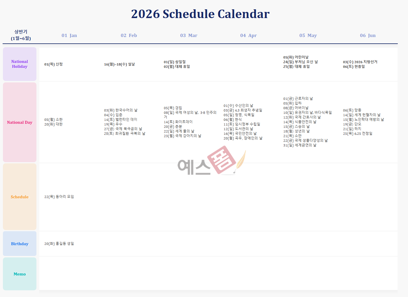 [2026년] 달력(월간 세부일정) - 예스폼 엑셀서식
