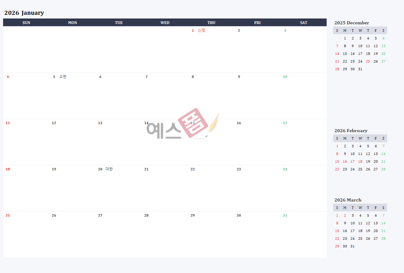 예스폼은 달력뿐만 아니라 계약서, 기획서, 회계장부, 인사 서식 등 업무에 필요한 모든 문서 양식을 제공하는 대한민국 대표 비즈니스 플랫폼입니다. 지금 바로 방문하셔서 2026년을 더욱 효율적으로 준비하시길 바랍니다! ✨