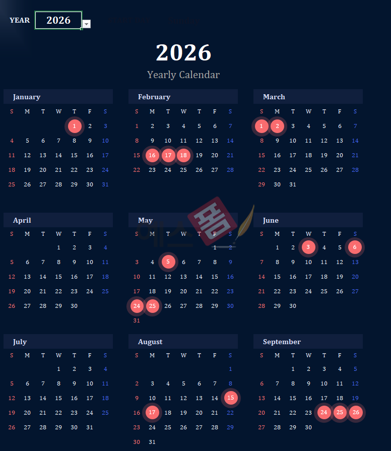 2026년 달력(Yearly Calendar)은 세로형 한 페이지로 세 가지 디자인으로 구성된 엑셀 달력입니다. 연도 선택 시, 해당 연도의 달력이 자동으로 표시되어 간편하게 연간 일정을 관리할 수 있습니다. 공