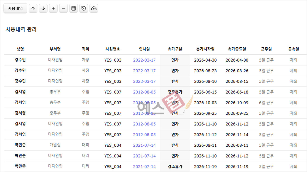 - 연차휴가 사용내역 관리: 날짜, 휴가 종류, 차감일수 입력