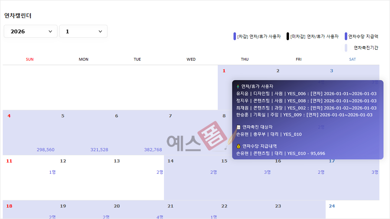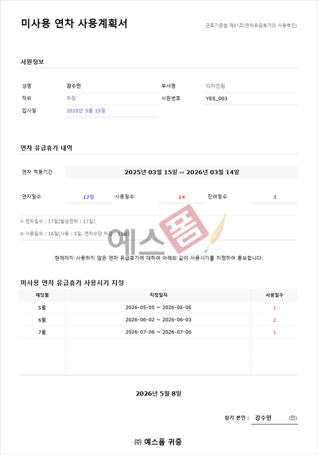 특히 예스폼의 연차관리프로그램은 근로기준법에 따른 연차 발생 조건과 연차촉진제도를 완벽히 반영하고 있어, 법적 리스크를 최소화하면서도 효율적인 연차 관리가 가능합니다.