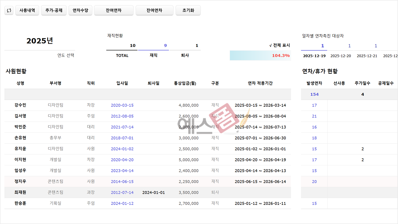 - 연차휴가 추가/공제 관리: 포상 연차, 무단결근 등 특별 처리