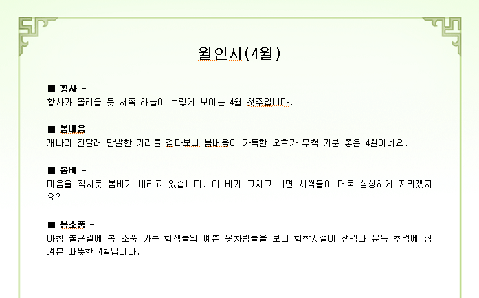 인사말 4월 계절인사 30개 예문모음 자료입니다. 4월에 사용하기 좋은 인사말 모음글 30개 입니다. 메일이나 편지 글을 작성 할때 넣기 좋은 문장들로 구성되어 있습니다.