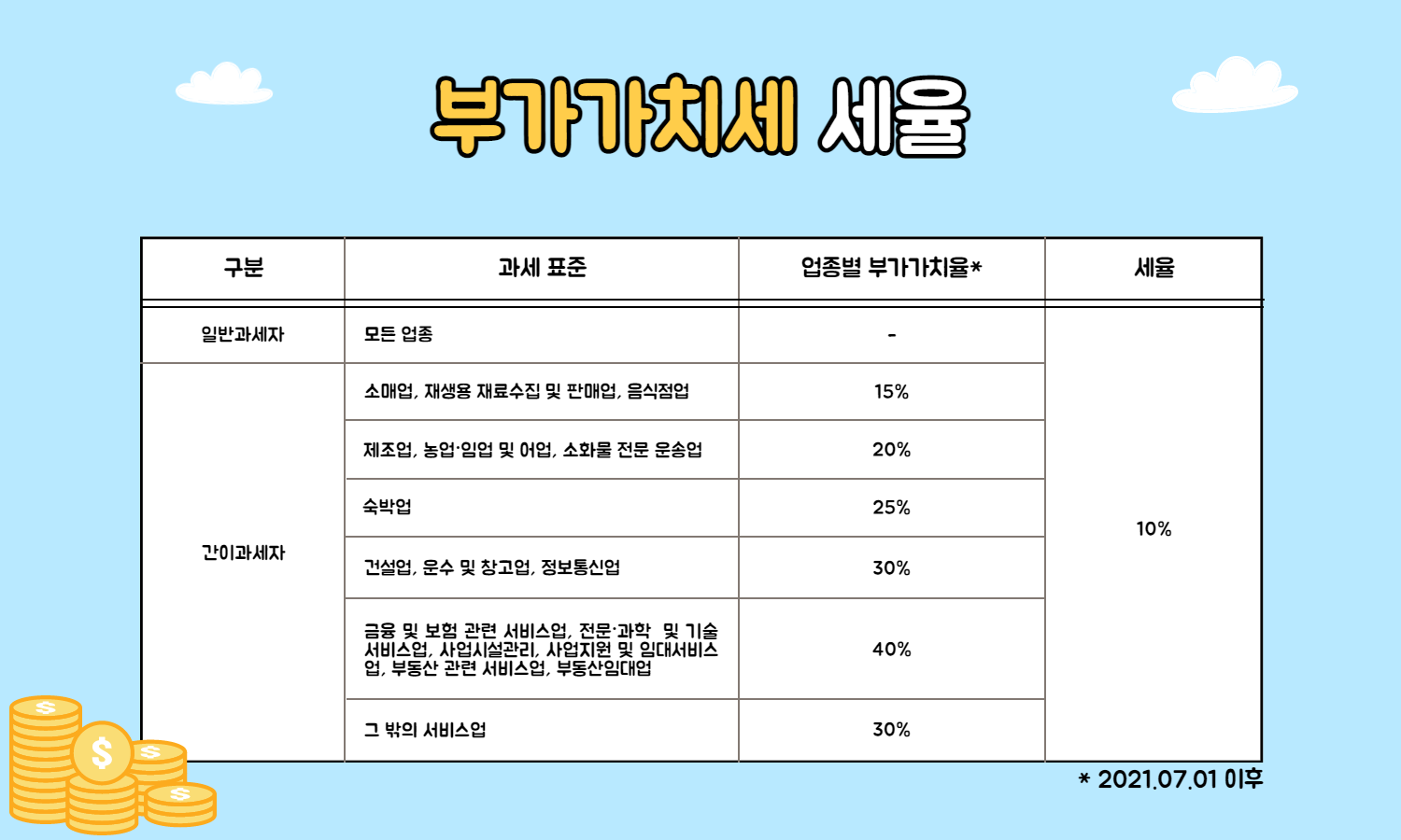 일반과세자는 모든 업종에 대하여 10% 세율이 적용되는 반면, 간이과세자는 업종별로 부가가치율이 다릅니다. 또한 2021년 7월 1일부터 기존 5~30% 였던 업종별 부가가치율이 15~40%로 변경되었으니 참고하시기 바랍니다.