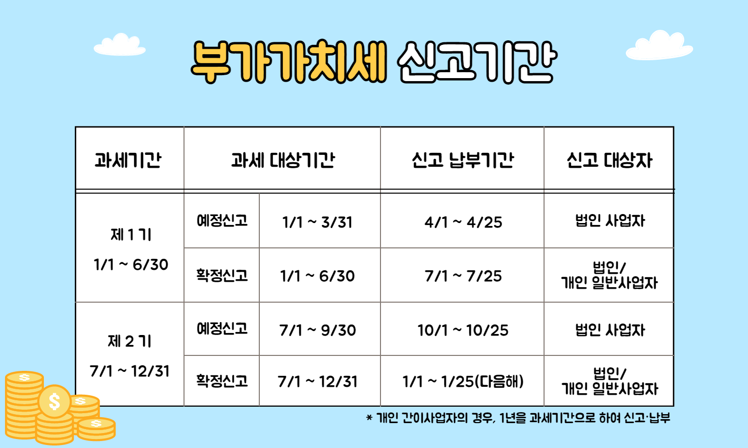 부가가치세는 6개월을 두고 과세기간을 가집니다. 해당 기간에 신고 및 납부를 하게 되는데 각 과세기간을 중간 즉, 3개월로 나누어 예정신고를 하게 됩니다. 일반적인 경우 법인사업자는 1년에 4회, 개인 일반사업자는 2회 신고하며 개인 간이사업자의 경우에는 1년을 과세기간으로 하여 이듬해 1월에 신고·납부하게 됩니다.