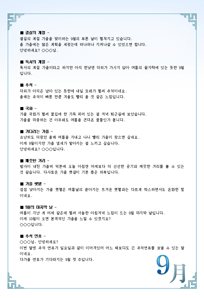 - 9월 말: 한 달을 마무리하며 10월을 준비하는 인사