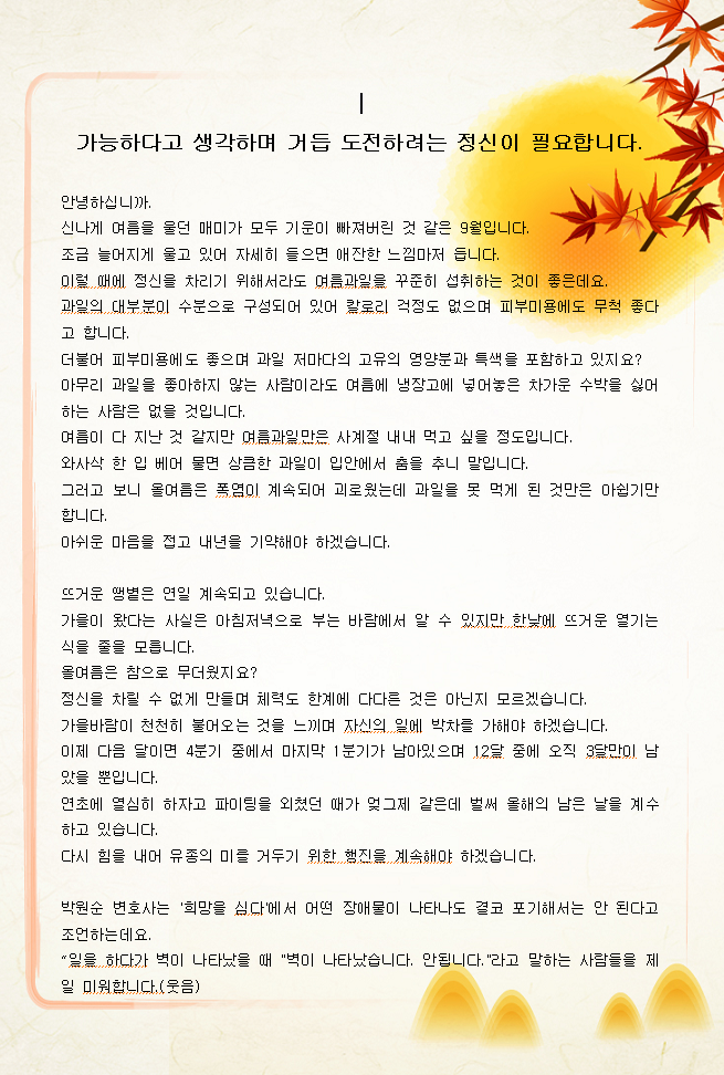 "가을의 문턱에서 더욱 발전하는 한 달 되시길 바랍니다."