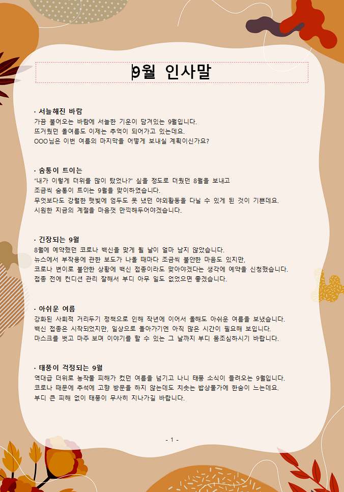 "9월이네요! 선선해진 날씨에 감기 조심하시고, 오늘도 좋은 하루 되세요 🍂"