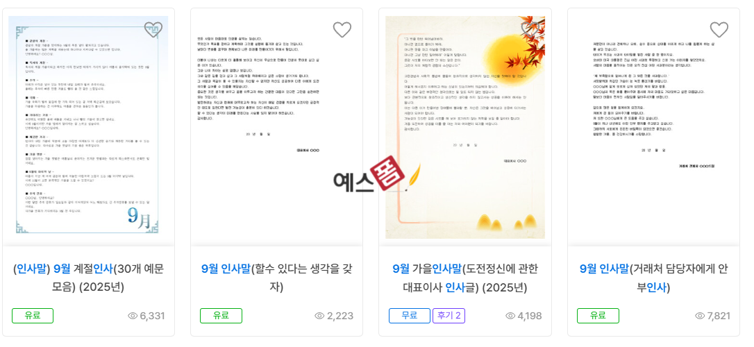 9월 인사말을 더욱 체계적이고 전문적으로 작성하고 싶으시다면, 예스폼에서 제공하는 다양한 인사말 양식을 활용해보세요. 예스폼의 9월 인사말 모음에는 상황별, 대상별로 정리된 풍부한 예문들이 담겨 있어 누구나 쉽게 활용할 수 있습니다.