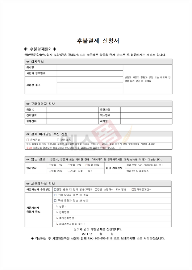 후불결제 신청서 ◈ 후불결제란? ◈ -법인회원(개인사업자 포함)전용 결제방식으로 주문하신 상품을 먼저 받으신 후 입금하시는 서비스 입니다. ☞ 회사정보 회사명 빈칸에 사업자 명판과 법인