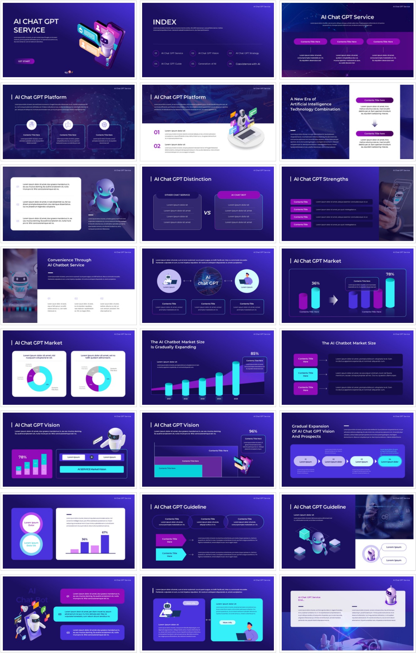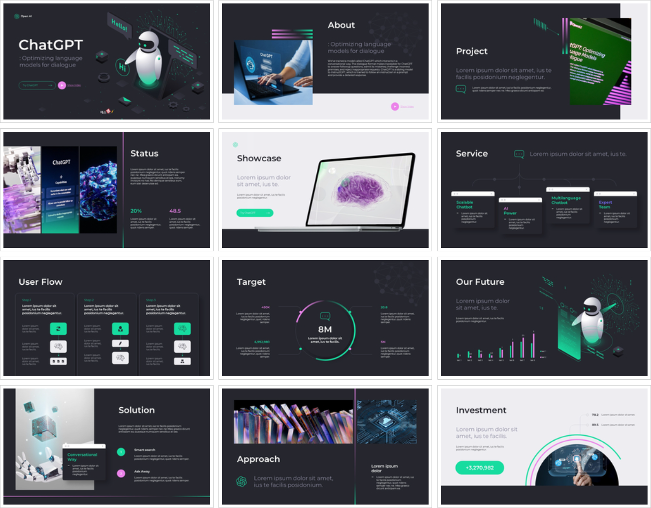 오늘은 최근 트렌드로 급부상하고 있는 ChatGPT를 테마로 한 파워포인트 템플릿 2건을 소개해 드렸습니다. 위에서 소개해 드린 ChatGPT ppt 템플릿을 활용하셔서 아직 압도적인 강자가 없는 인공지능 시장에서 새로운 비즈니스 기회를 창출해 보시기 바랍니다.