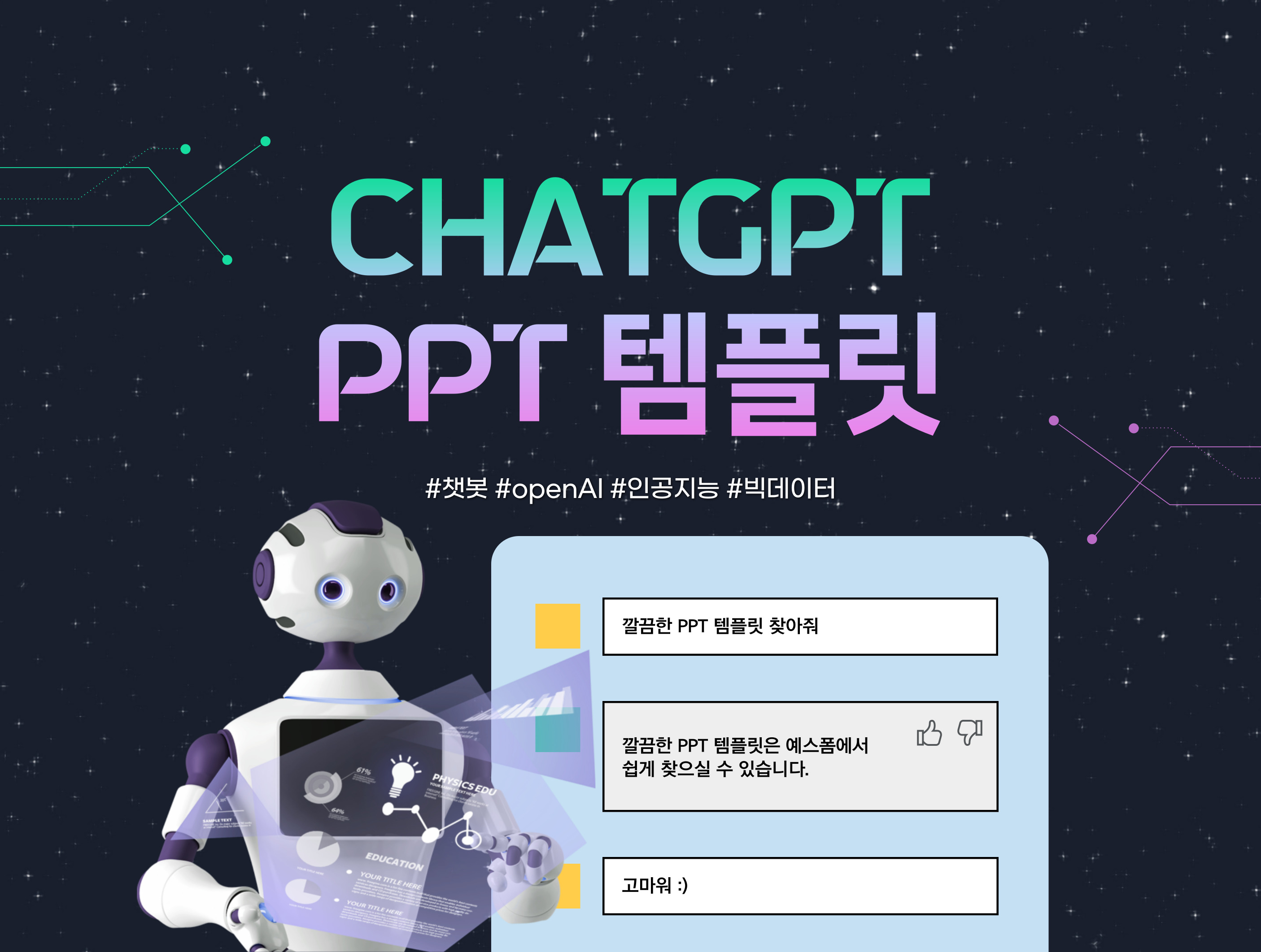 오늘은 ChatGPT를 테마로 하는 ppt템플릿을 소개해 드리려고 합니다. 챗봇을 시작으로 인공지능 관련 산업이 무궁무진하게 발전할 것으로 기대되는 요즘, 예스폼에서 새롭게 업데이트 한 ChatGPT ppt 템플릿을 활용하셔서 관련된 사업제안서나 보고서를 작성하여 새로운 비즈니스 기회를 만들어보시기 바랍니다.