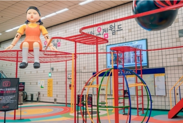 최근 넷플릭스 <오징어 게임>을 홍보하기 위해서 드라마 속의 일부 장면 및 컨셉을 활용한 체험 공간 팝업스토어가 오픈했습니다.
