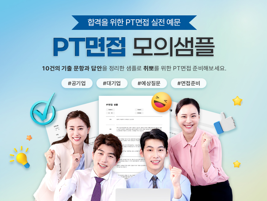 오늘 소개해드린 PT면접 모의 샘플 이외에도 PT면접 기출 문항과 답안을 아래 링크에서 만나보실 수 있습니다.