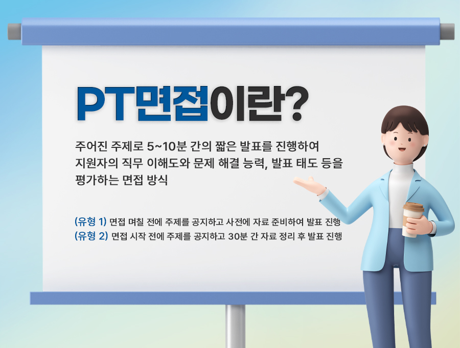 최근 공기업, 대기업 채용전형을 확인해보면 PT면접이라는 단어를 빼놓을 수가 없는데요. 서류전형과 인적성검사를 통과했지만 면접 전형 그중에서도 PT면접에서 고배를 마시는 경험을 한 취준생분들이 적지 않은 것 같습니다 😥