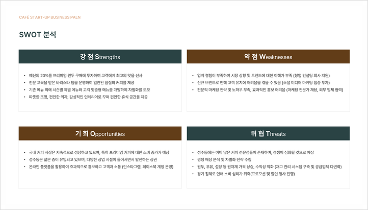 카페 SWOT 분석을 행렬형으로 배치시킨 SWOT 다이어그램입니다.
