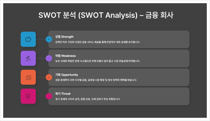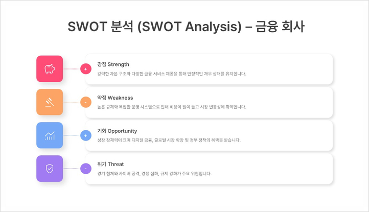 금융 회사 SWOT 분석을 목록형으로 배치 시킨 SWOT 다이어그램입니다.
