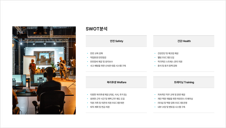 | 경영 추진을 위한 SWOT | 방송 스튜디오 맞춤 SWOT 분석 | 화장품 제조 SWOT 분석 |