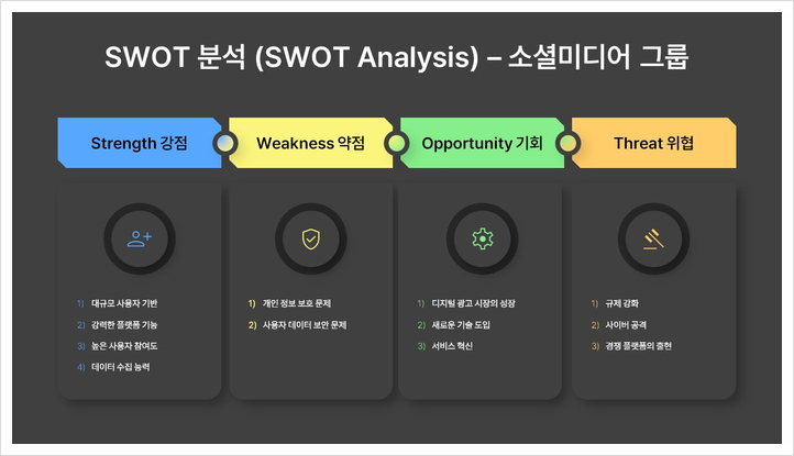 소셜미디어 그룹 SWOT 분석을 목록형으로 배치시킨 SWOT 다이어그램입니다.