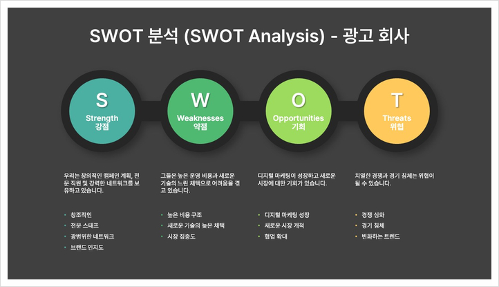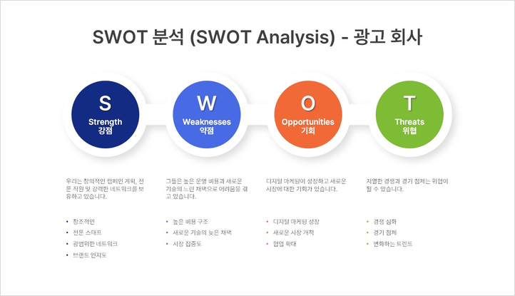 광고 회사 SWOT 분석을 목록형으로 배치시킨 SWOT 다이어그램입니다.