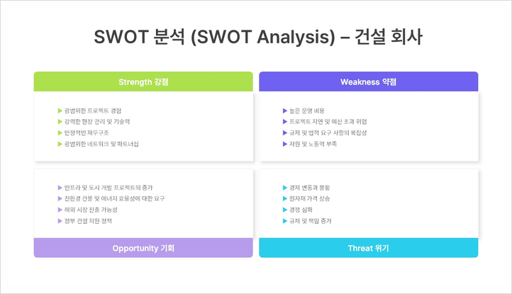 건설 회사 SWOT 분석을 행렬형으로 배치 시킨 SWOT 다이어그램입니다.