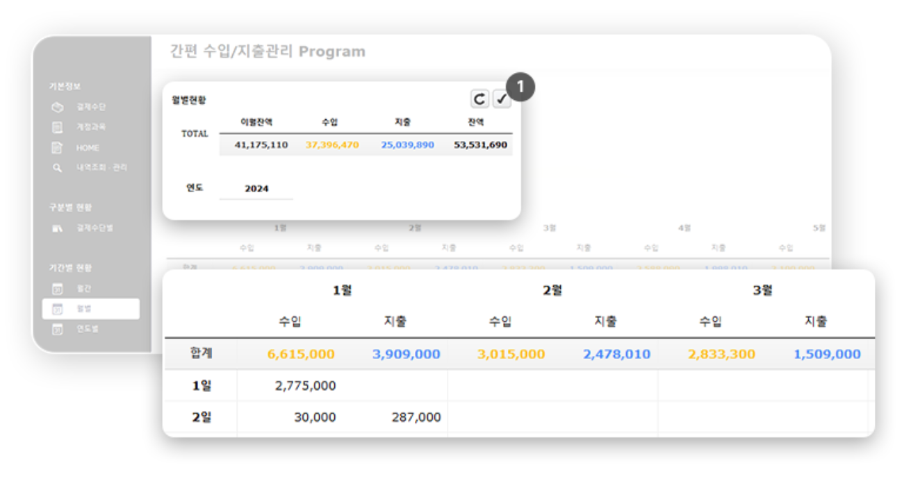 1️⃣ 연도, 월 설정 시 해당 기간의 수입/지출/카드 사용액이 캘린더에 표시됩니다.