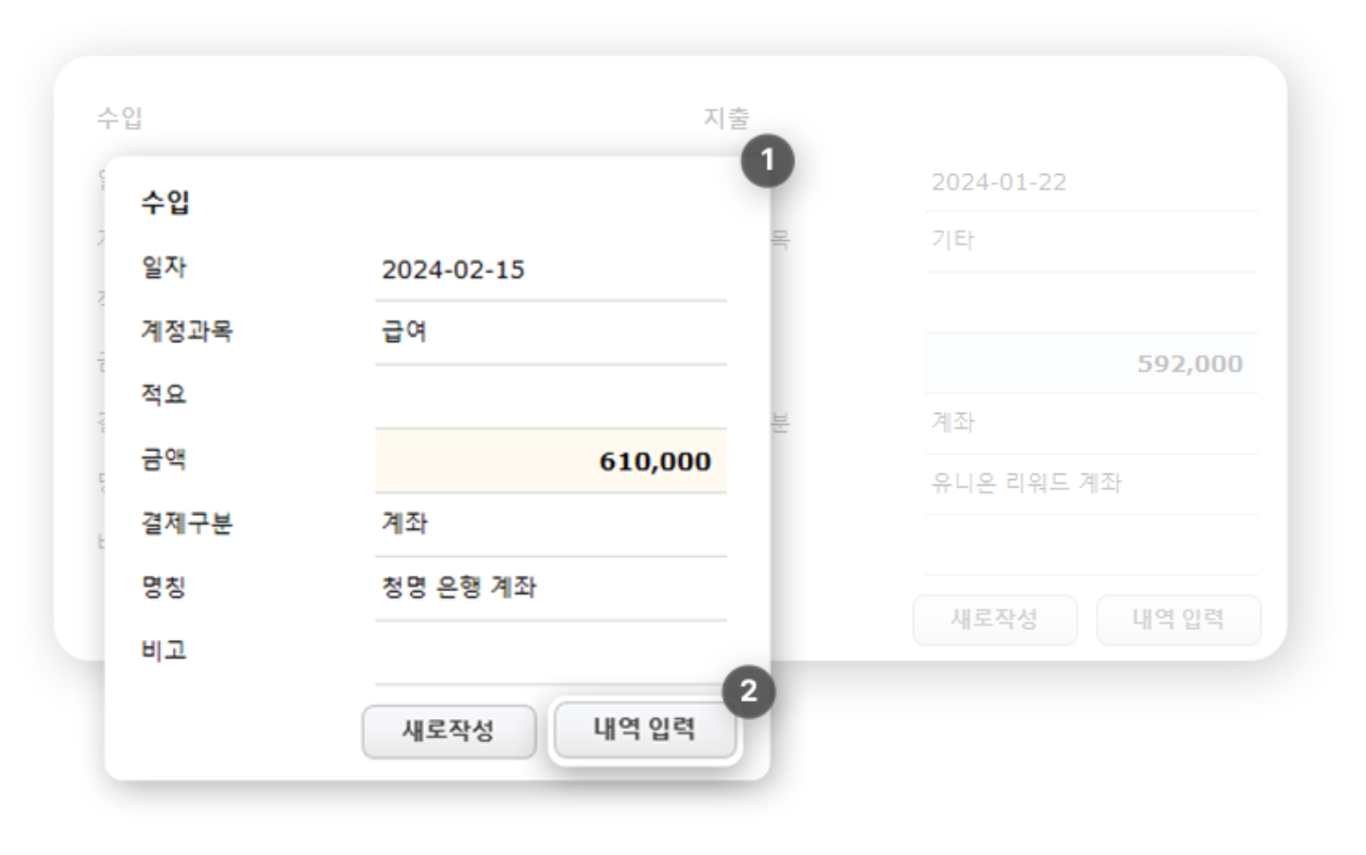 2️⃣ 버튼을 클릭하여 내역을 입력합니다.