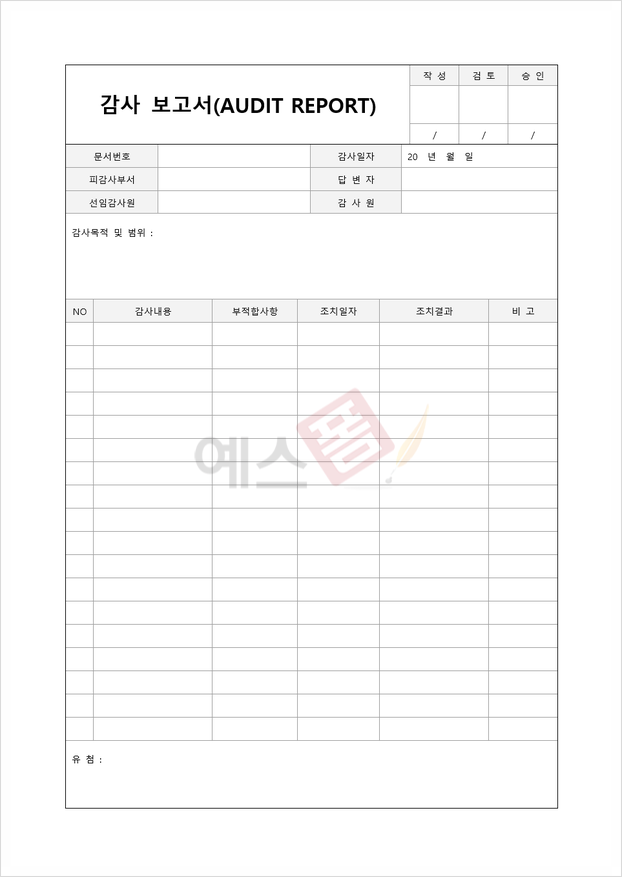 또한 예스폼에서는 감사를 진행하고 그 결과 및 시정 조치에 대해 보고하는 감사보고서 서식 역시 제공드리고 있는데요. 만일 감사 내용과 부적합 사항 및 감사 결과를 기재하고 그에 따른 시정 조치사항을 파악하여 보고하는 감사보고서 서식이 필요하신 분들이라면 해당 내용 구성을 참고해 보시기 바라겠습니다.