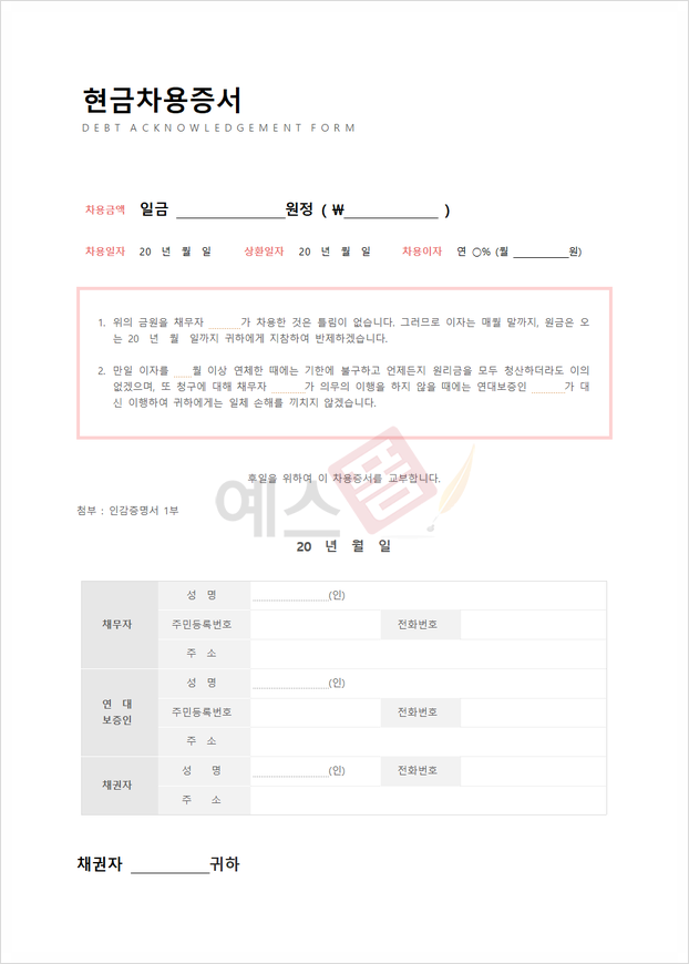 채무자가 채권자로부터 상기 금액을 차용했음을 확인하는 예스폼 금전 차용증서 양식 및 예시입니다.