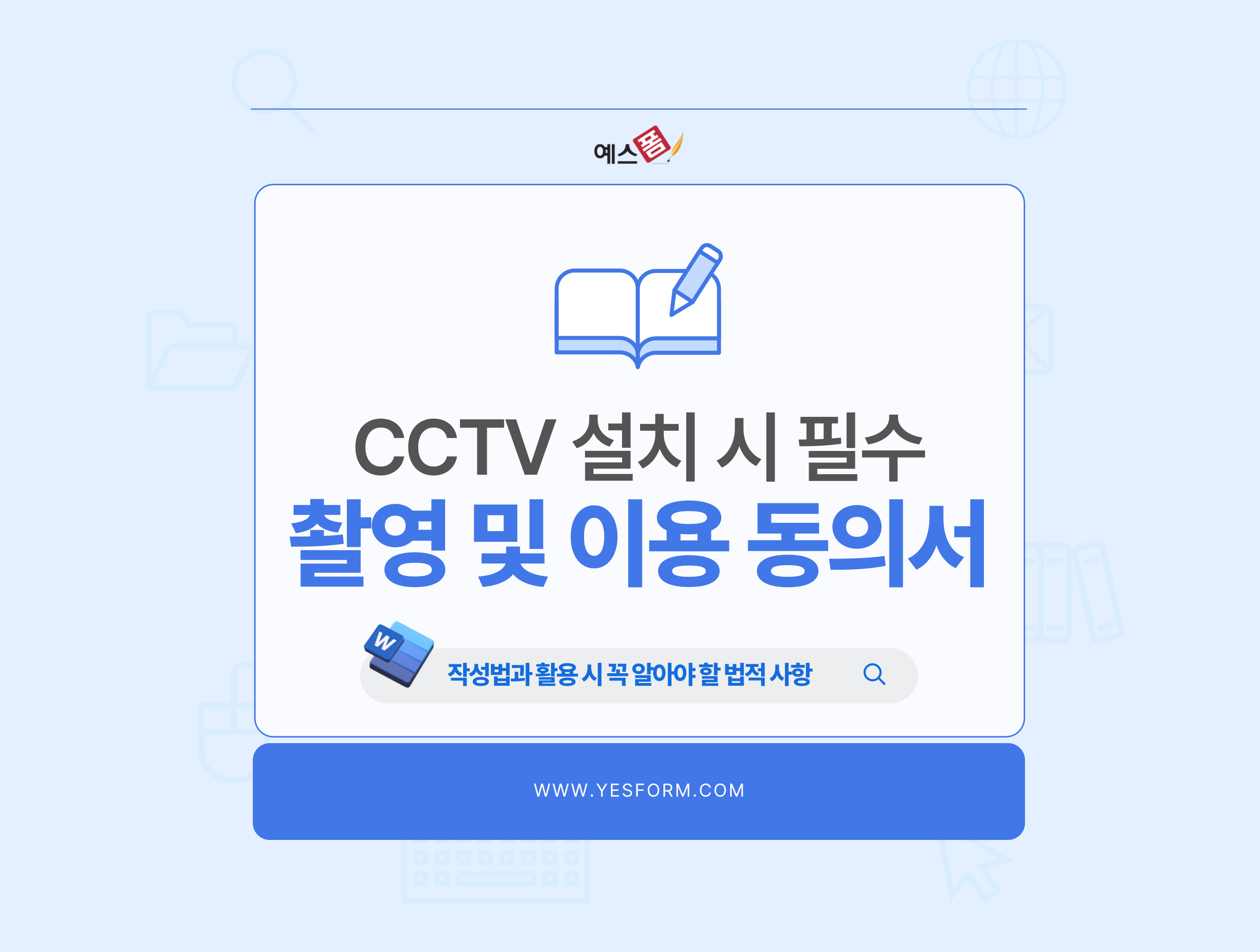 CCTV 촬영 및 이용 동의서는 개인정보 보호법에 따라 필수적으로 작성해야 하는 문서입니다. 제대로 작성하지 않을 경우 법적 책임을 질 수 있으므로, 반드시 꼼꼼하게 확인하고 작성해야 합니다. 또한, 수집 목적과 범위를 명확히 하고, 개인정보 보호를 위한 조치를 취하는 것도 중요합니다. 이번 포스팅이 CCTV 촬영 및 이용 동의서를 작성하시는 분들께 도움이 되었길 바랍니다. 다양한 상황에 알맞은 예시가 기재되어 있는 CCTV 촬영 동의서 양식, CCTV 이용 동의서 양식을 예스폼에서 제공 중이니 참고해 보시기 바랍니다.