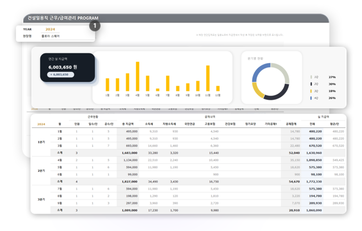 작성한 근로내역을 바탕으로 현장 · 근로자별, 월간, 연간 현황을 조회하는 시트입니다.