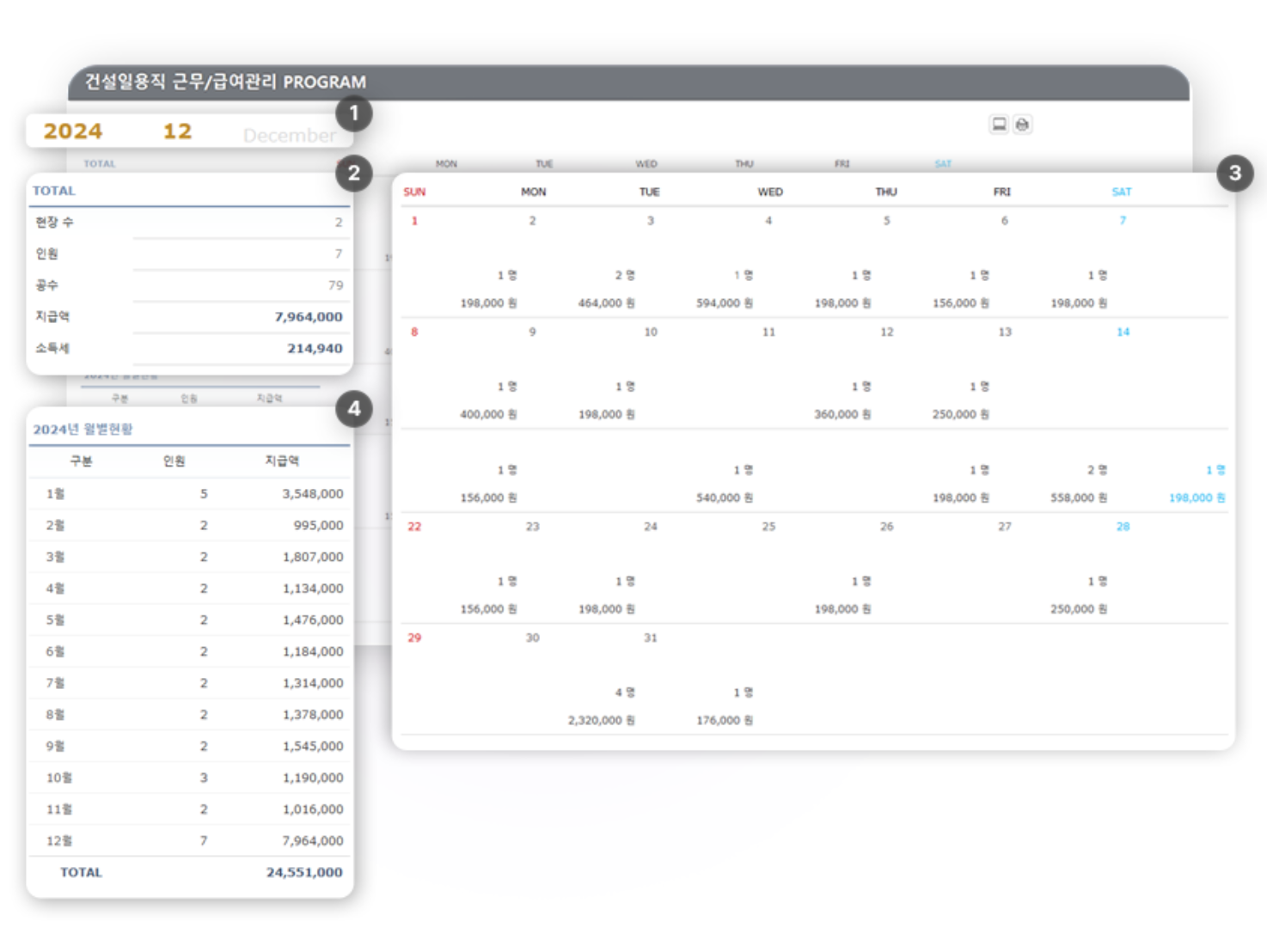 3️⃣ 일별 근로자 수 · 지급액 현황이 캘린더에 표시됩니다.